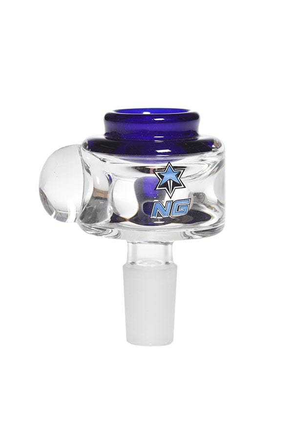 Made by Nice Glass these quality thick clear glass bowls come with single hole color inset for the herb. This bowl has a glass marble that functions as a roll stopper and comes in a range of color options.