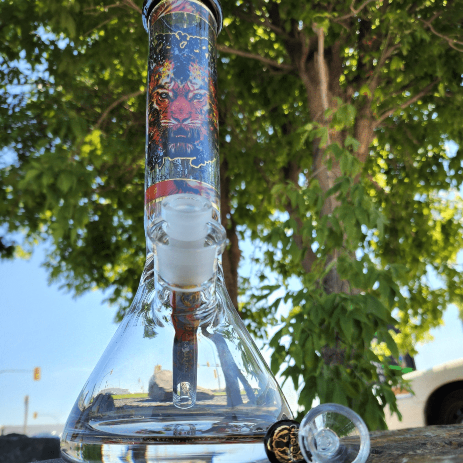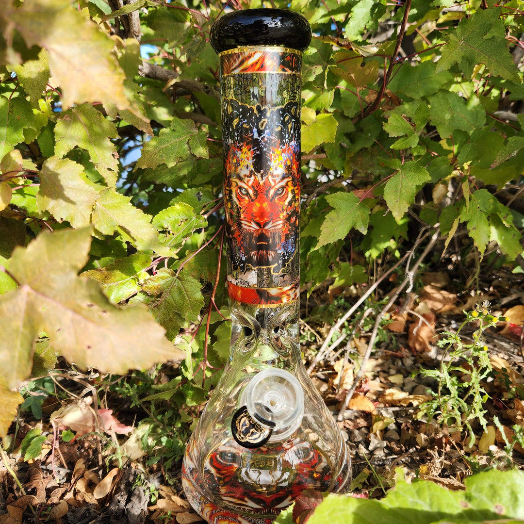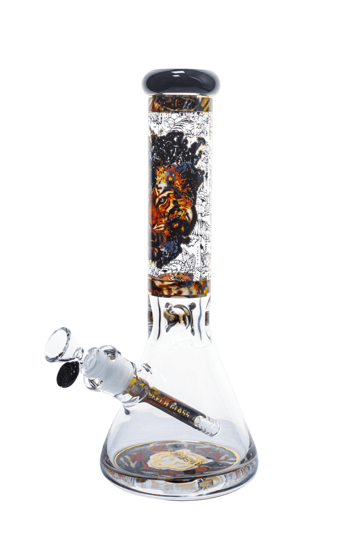 Introducing the Cheech Glass 13" Tiger Beaker Bong with a 12mm thick base that is made from high-heat, crack-resistant borosilicate glass, features a fierce tiger decal wrapping around the neck of the bong and base, as well as a matching tiger bowl.