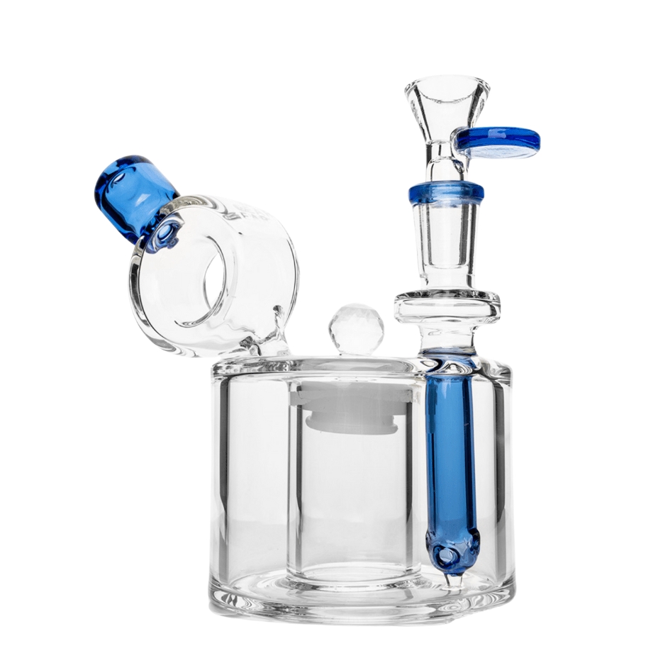 Enjoy a comfortable smoke with an angled mouthpiece featuring an elegantly designed splashguard and achieve the pinnacle of convenience with this all-in-one borosilicate bubbler.