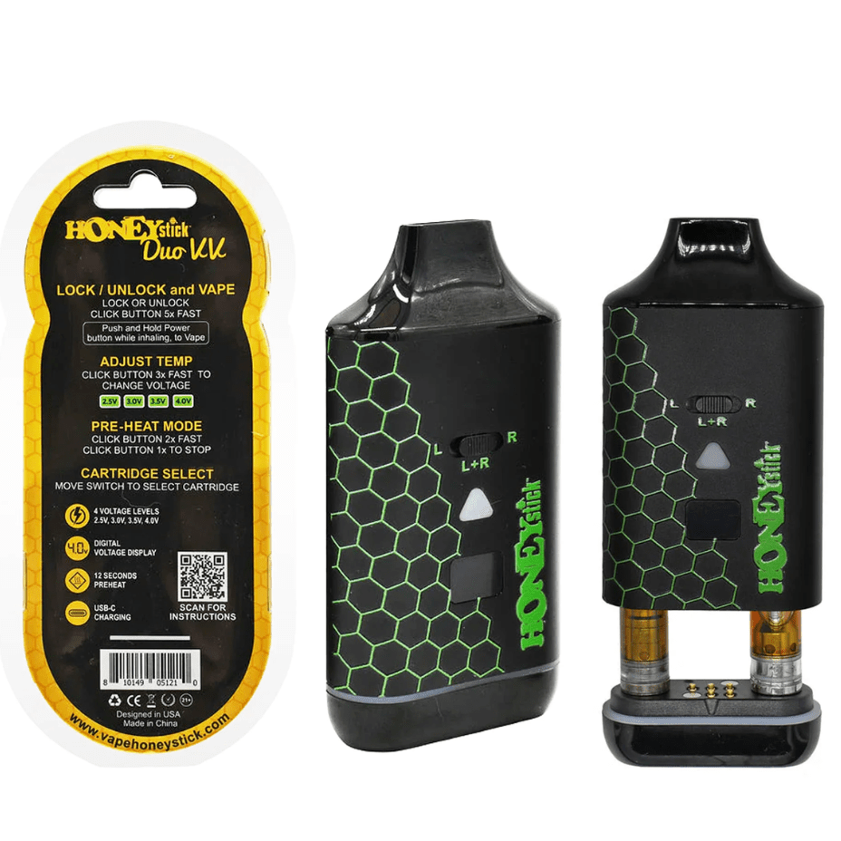 Introducing the Honeystick DUO VV dual 510 cart battery with 4 variable voltage settings (2.5V, 3.0V, 3.5V, 4.0V)! This new battery lets you smoke two arts at the same time or just one at a time! Honeystick designed it for those who love vaping and crave the freedom to mix things up.Â