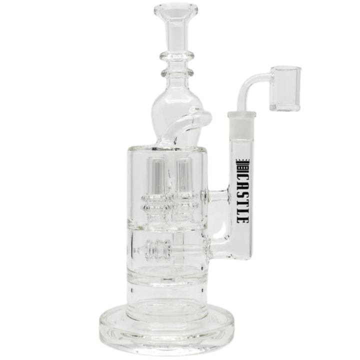 Castle Glassworks 7mm Stemless Big Boy Recycler Dab Rig with Inline to Triple Showerhead Percs is 12" Tall with a wide 5mm Thick base so it won't topple over. Castle includes their 14mm thick bottom Quartz Banger with a retail value of $35.00.