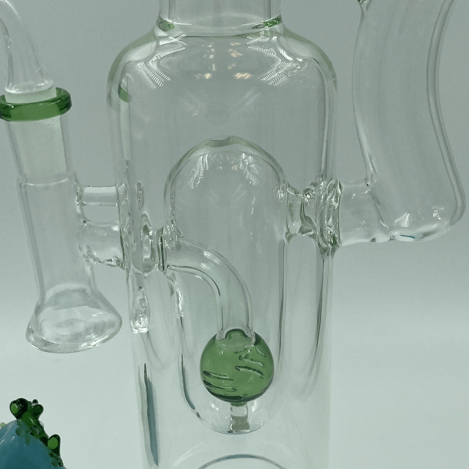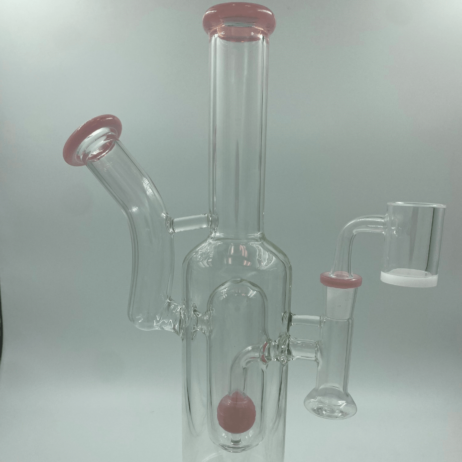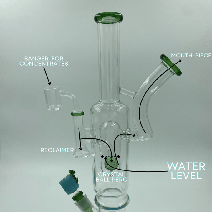 This new arrival by High Class Glass is definitely one of a kind. With 2 Different chambers making it 2 bongs in one. With the top one being more intended for dab/concentrates use, and the bottom one being more intended for flower/bud use. But don't fear one doesn't need plugging in order to smoke out of the other. With a Reclaimer on top 14mm insert so that you can reclaim your concentrates!Â