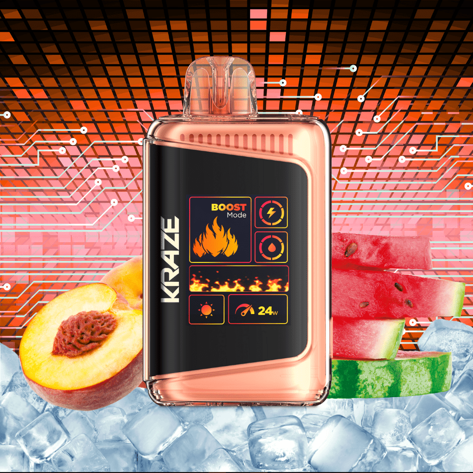 Kraze HD Mega 20k Fruit Flash Ice disposable vape Experience the juicy freshness of Peaches and ripe sweet Watermelons, finished off with a refreshing ice cool hit to round out the sweetness and leave your palate chasing more. With up to 20,000 Puffs, Dual mesh coils and a very detailed 1.77" screen these are an absolute unit of a disposable!