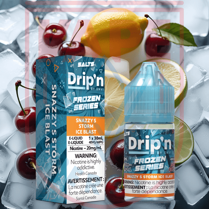 Drip'n by ENVI Frozen Salt-Snazzy S Storm ICE BLAST kicks it up a notch with a delicious fusion of dark cherries, tart red raspberries. Add a mouth watering twist of orange, lemon and lime citrus all finished perfectly with a BLAST of icy mint.