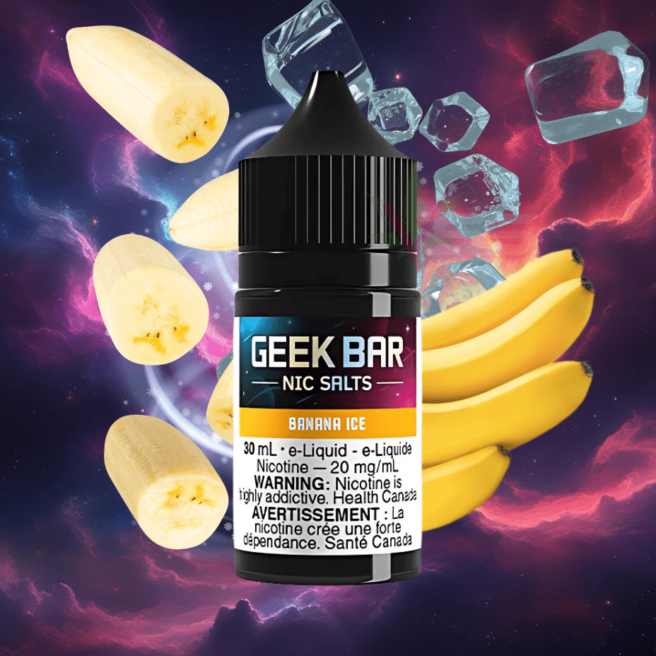 Shop Geek Bar Nic Salt in Steinbach, Manitoba. Indulge in BANANA ICE flavour of rich ripe bananas on the inhale and a cool, icy hit on the exhale.  This is the popular flavour from Geek Bar Pulse X disposable vape line which is now available in a 30ml salt.