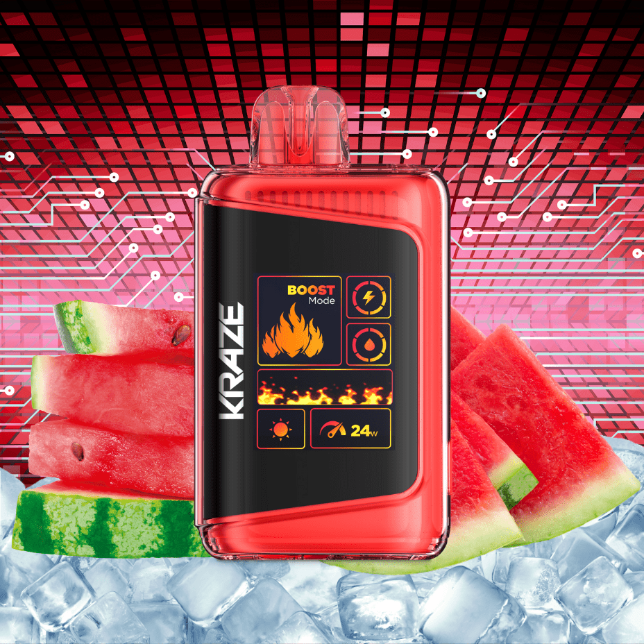Kraze HD Mega 20k Watermelon Ice disposable vape Let your tastebuds soak up the summer time with this amazing, Juicy, Sweet, Ripe Watermelon flavor! finished off with the perfect amount of ice, This is a super refreshing disposable. Â With up to 20,000 Puffs, Dual mesh coils and a very detailed 1.77" screen these are an absolute unit of a disposable!