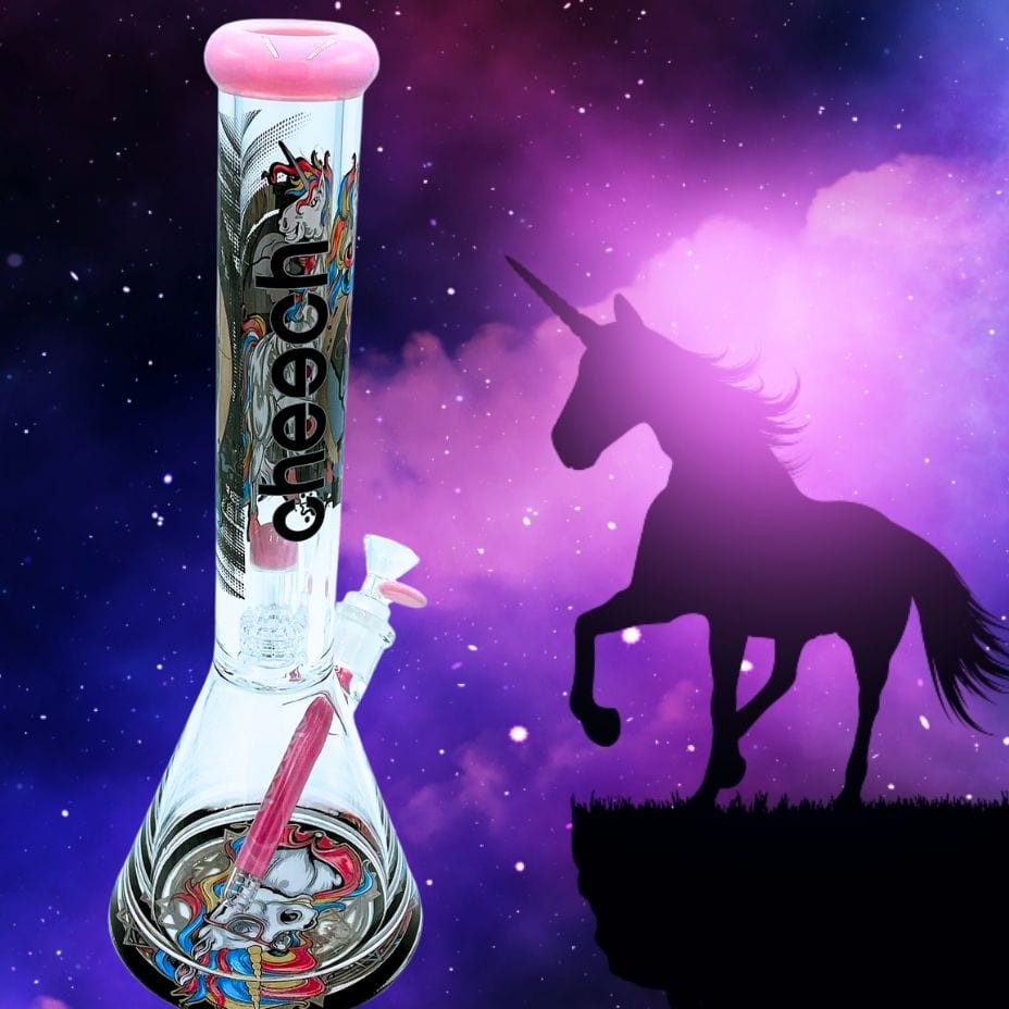 Cheech Glass 12mm Unicorn Decal Beaker w/15mm Base-Every time you take a hit from this water bong, a unicorn gets its wings. This unique glass bong is decaled with rainbows, unicorns, and a lot of colors. This Unicorn beaker bong by Cheech Glass is an astounding 4lbs and hand-blown with 100% borosilicate glass with an insane beaker base thickness of 15mm. This high-quality bong features a classic beaker shape, a mesmerizing unicorn design not only on the neck of the bong but also on the base and a percolator for smoother and cooler hits.