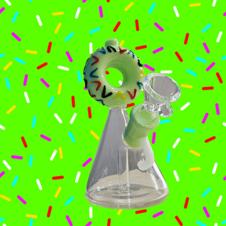 Hungry for a snack? High Class Glass has made the perfect doughnut rig for all your needs. Standing at 6in Tall, and a Firm Beaker Base. Also with a curved fixed down-stem to the base of beaker. Including a 14mm Dab Banger and a perfect little mouth piece coming out the top of the doughnut.