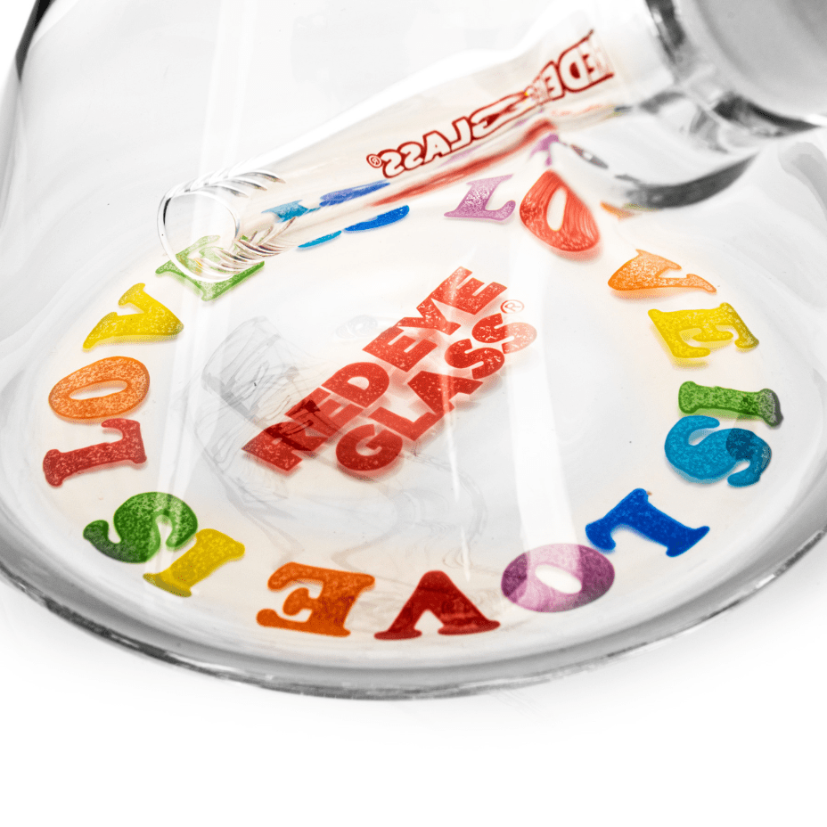 Red Eye 7mm Rainbow Love Beaker Base Bong is throwback to the hippy era of peace and love everywhere! This bong features an extra-thick 7mm design, a built-in ice catcher, and a colourful decal design on the base that says "love is love". Show the world that love is love and rep your rainbow pride with this colourful water pipe!