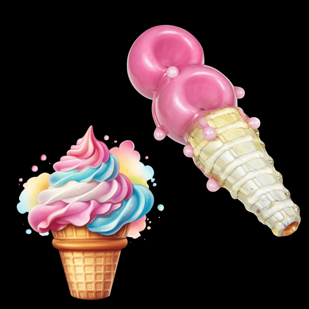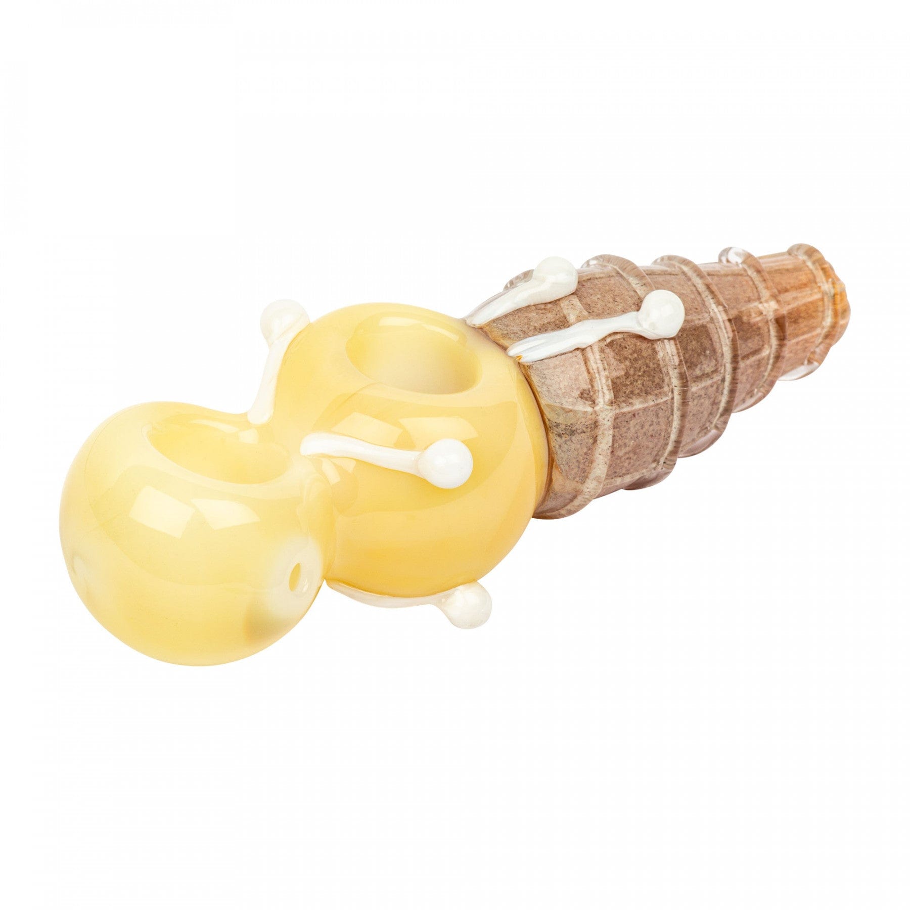 Red Eye Glass Two Scoop Hand Pipe with 2 Bowls measuring 5 inches long. Step you sessions up with double the scoops for double the fun! The Two Scoop Hand Pipe from Red Eye Glass® features dual bowls and an iconic cream cone design.Â
