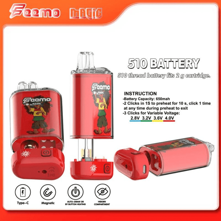 Introducing the Feemo Magic 510 battery! This device features a 510 threaded base that magnetically connects onto the gorgeous case to both hide and protect your THC cartridge. The Feemo Magic 510 battery is equipped with a 650mAh rechargeable type-c battery that offers 3 different voltage settings. With auto-draw or button-firing option and a pre-heat option, this device ensures you won't have to deal with a clogged cart again.