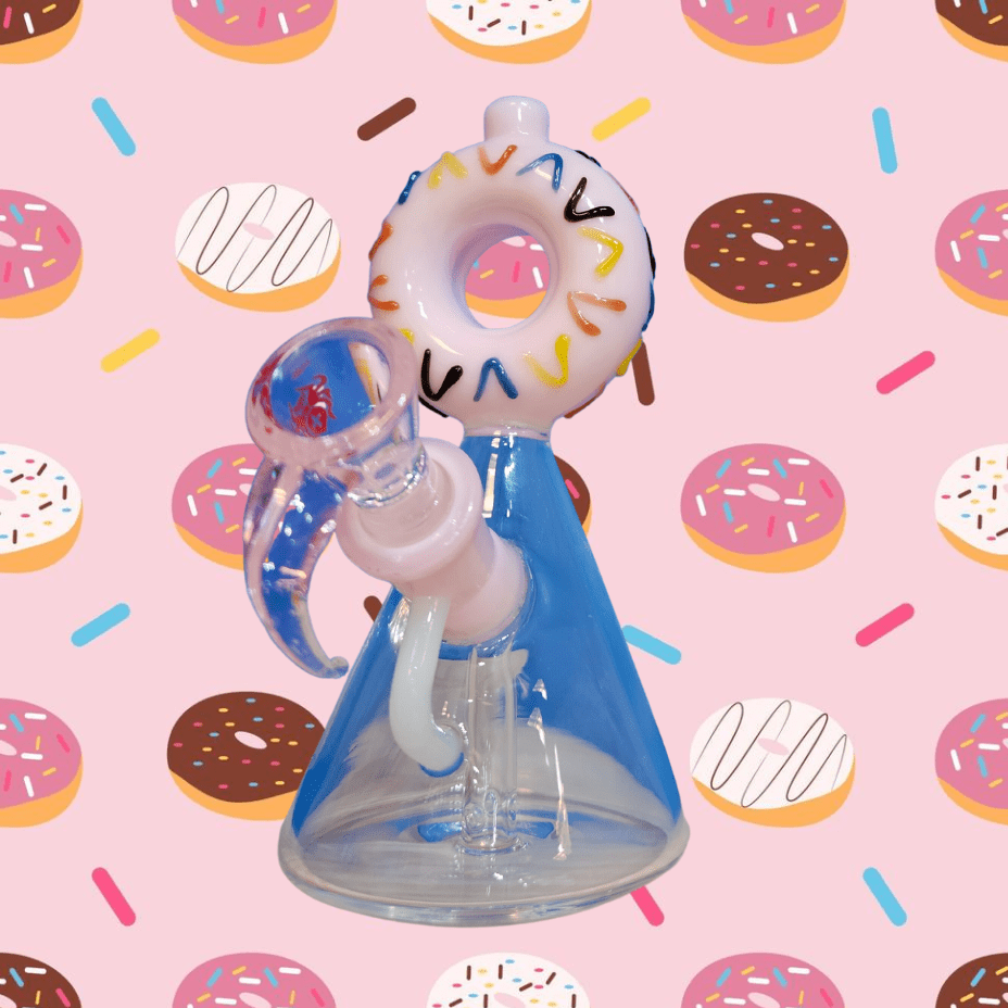 Hungry for a snack? High Class Glass has made the perfect doughnut rig for all your needs. Standing at 6in Tall, and a Firm Beaker Base. Also with a curved fixed down-stem to the base of beaker. Including a 14mm Dab Banger and a perfect little mouth piece coming out the top of the doughnut.