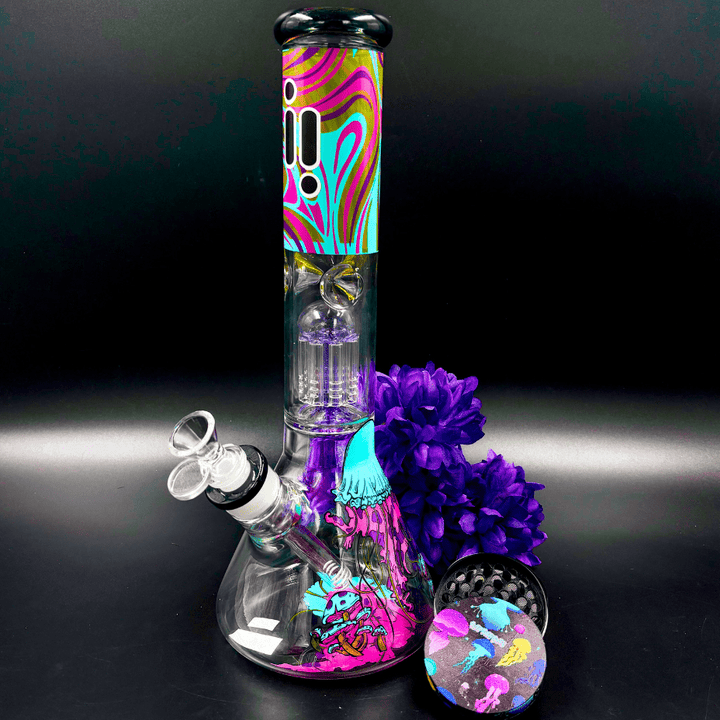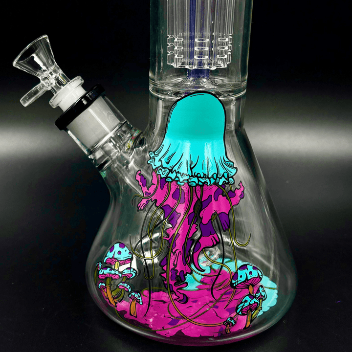 Decorated in beautiful bright shades of pink, yellow, purple and blue highlights the essence of the jellyfish. Featuring two heat bonded jellys, one on the side of the beaker and one on the base, and neon mushrooms on the sides as well.