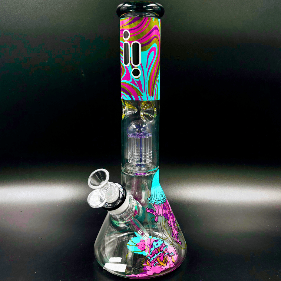 Unleash your wild side with this 14" Jellyfish Beaker by Infyniti. This untamed series features glorious animal artwork. Crafted from pure 7mm borosilicate glass doesn't only promise durability, but also longevity. Featuring a six-arm tree perc, there's no doubt you will enjoy smooth smoke every rip!