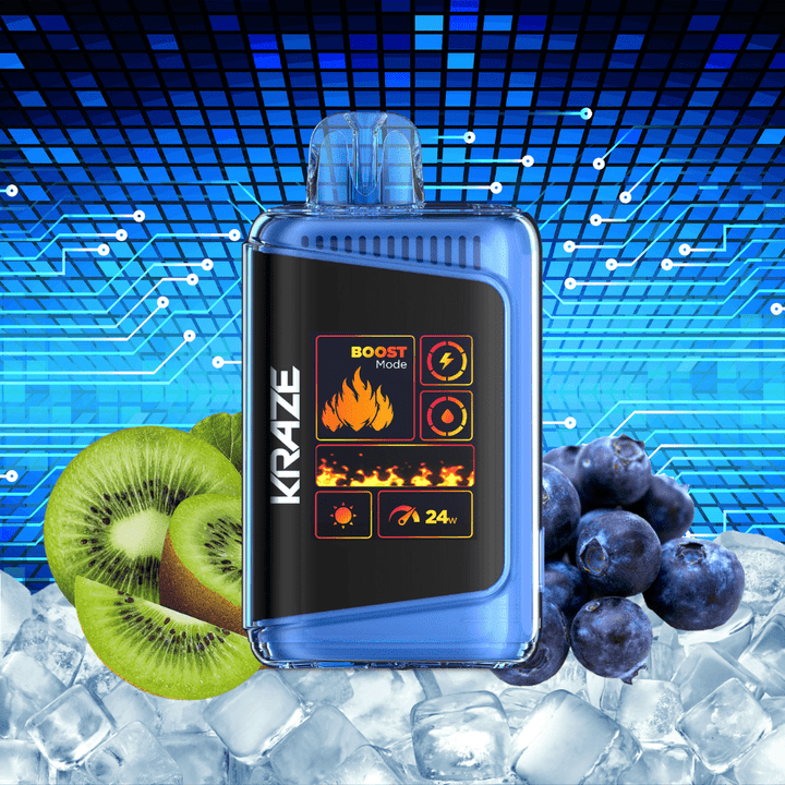 Kraze HD Mega 20k Blueberry Kiwi Ice disposable vape, With a blast of fresh picked Blueberries rounded out by a smooth delicious Kiwi and a nice icy finish this is a incredibly refreshing flavor. With up to 20,000 Puffs, Dual mesh coils and a very detailed 1.77" screen these are an absolute unit of a disposable!