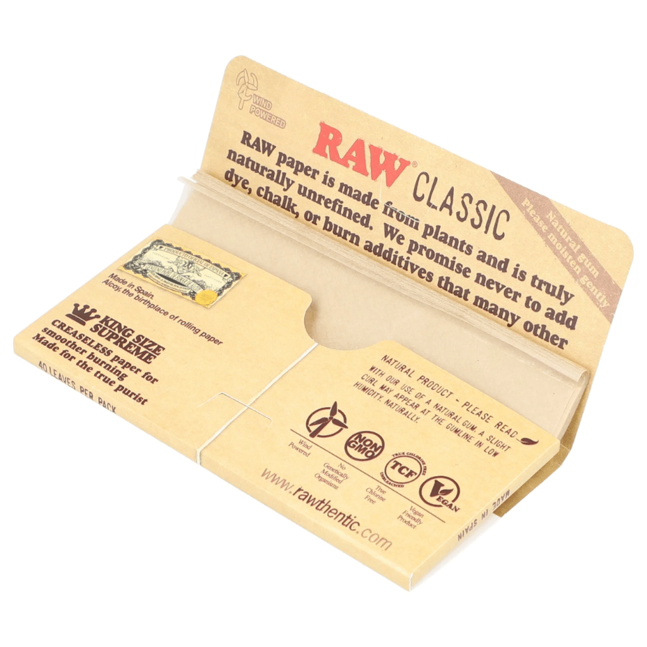 Raw Classic King Size Supreme Rolling Papers 1 1/4 size with 40 leaves/pack. Raw is all natural additive-free, 100% vegan with translucent Ultra thin rolling papers. They are unbleached and chlorine free.