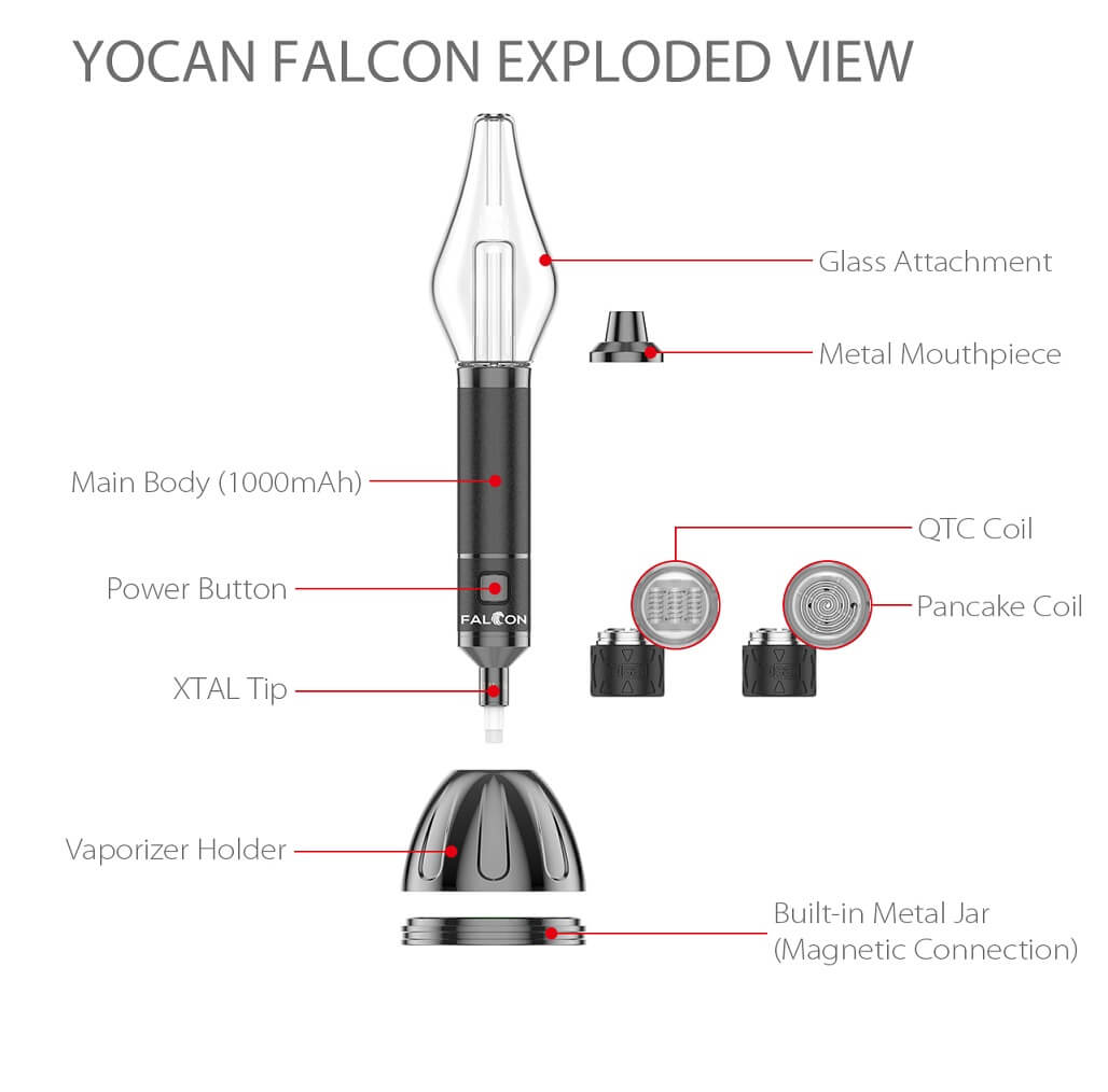 The Yocan Falcon 6 in 1 vaporizer is here and it's fire! Newest to the Yocan market, coming with an internal 1000mAh battery the Yocan Falcon gives you the best of what a vaporizer pen can do with its incredible multiple functions. The future of vaping has arrived, in the form of the electric smart e-rig vaporizer, No more wasting, now you can have vape rig performance in one compact device. The simplicity of Yocan Falcon vaporizer combined with strong, flavorful vapor production has led to a rise in the popularity of the modern smart rig.